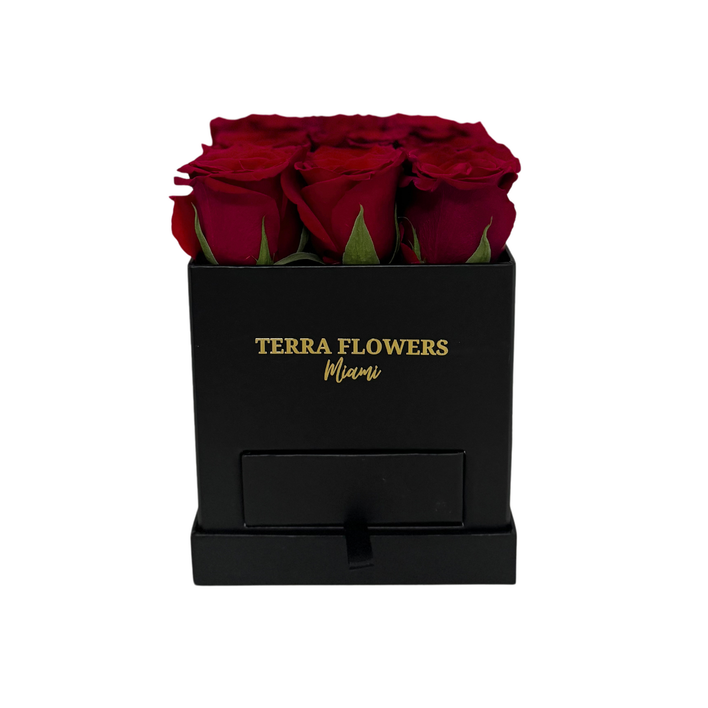 Charm your way with this petite rose box designed with fresh roses and a surprise drawer that is filled with complimentary chocolates
