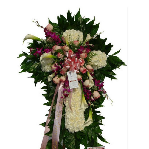 This All White Funeral Standing Cross is designed with white premium hydrangeas and a centered corsage of ivory white roses and additional white filler flowers such as baby breathe, stock, etc.